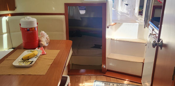 Cama a proa trasversal - sobre banda de estribor mesa dinete - sobre babor baño compartimentado y cocina - amplia conejera a popa - cockpit con timonera y solarium en proa con colchonetas.